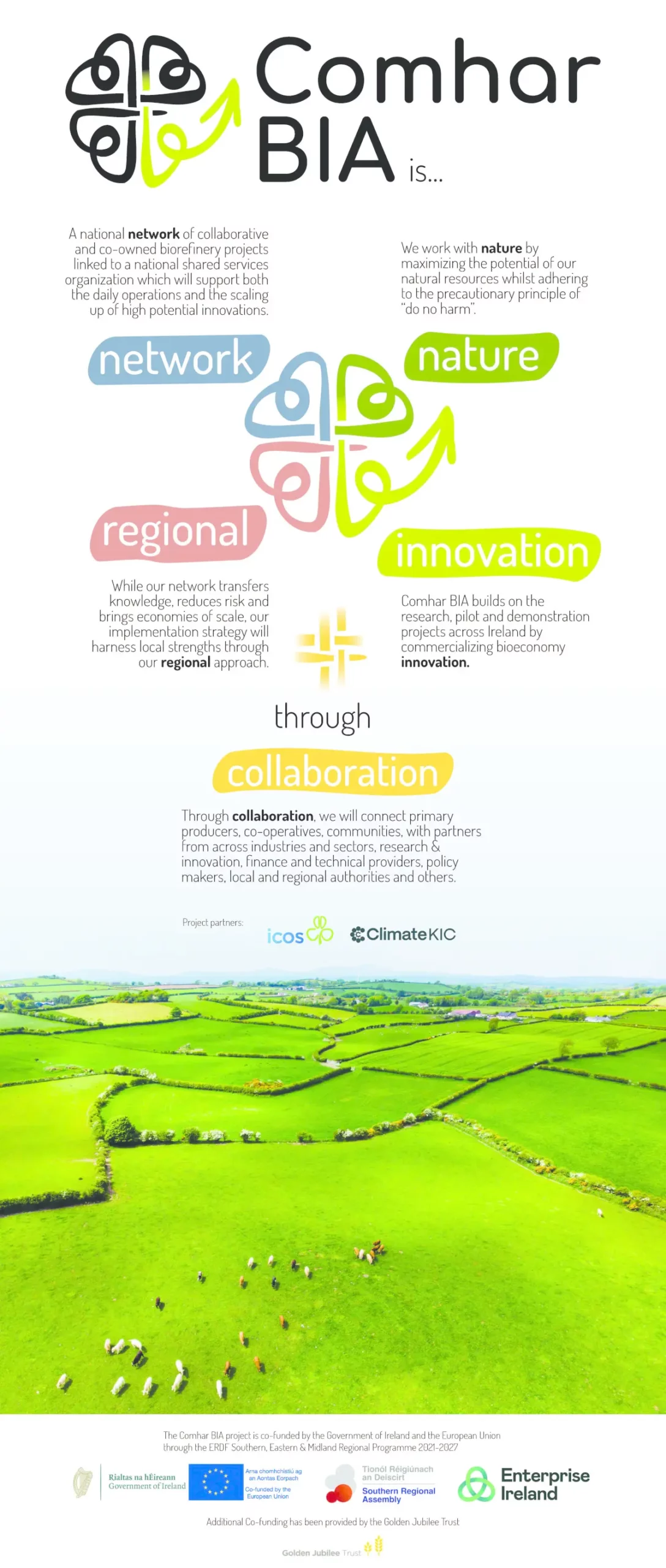 The Comhar BIA project commenced in 2025 with a formal partnership between ICOS and Europe’s leading climate innovation agency Climate KIC, and builds on the work of both organisations in the development of Ireland’s Bioeconomy. Comhar BIA will develop a network of regional, collaborative and co-owned biorefineries with a supporting enabling shared services structure to accelerate commercial development and innovation. In Spring 2025 ICOS held an expression of interest process for members to participate in a feasibility study and Arrabawn-Tipperary Co-operative were selected to participate in this first study which was funded by the Enterprise Ireland Smart Regions Innovation Scheme and is co-funded by the Golden Jubilee Trust. The techno-economic work was conducted by AtkinsRealis with additional input from Climate KIC and ICOS. It is hoped that this work will lead to the development of a future-resilient biorefinery in the mid-west with a biomethane facility as a core technology. Follow-on phases will formalize ownership structures, partnerships, financial models and detailed design. This unique approach should result in a more integrated value chain with greater security of supply and the sharing of economic, social and environmental benefits across regional partnerships.